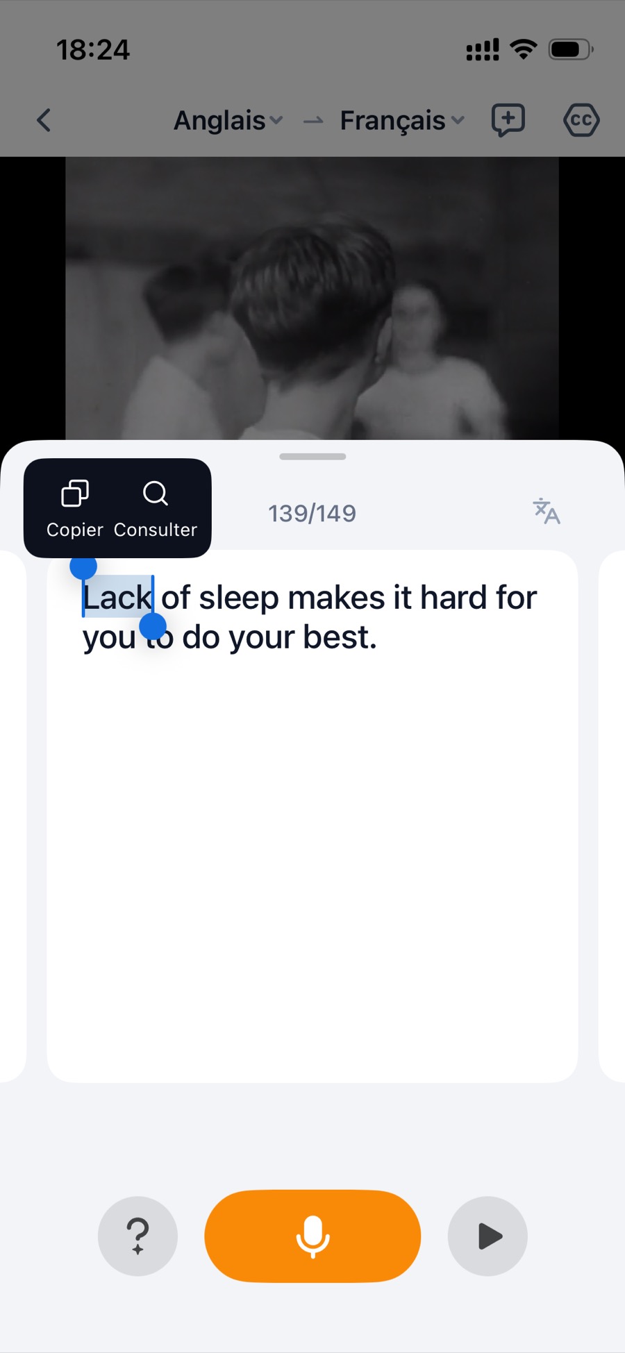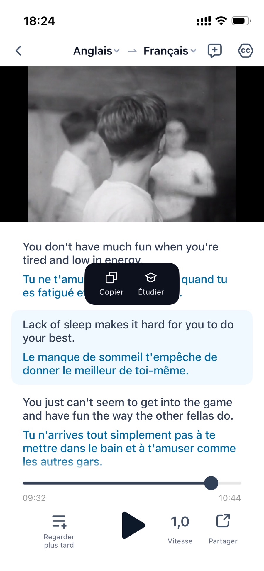 - Ou dans la traduction vidéo ou audio, appuyer longuement sur une ligne de sous-titre